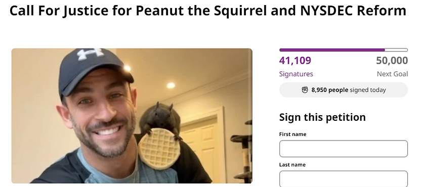 Beloved Peanut the Squirrel was taken away from his home by NYSDEC and euthanized. The seven year old rescued squirrel represented P’Nut’s Family Freedom Farm Animal Sanctuary an organization devoted to rescuing and rehabilitating injured and abandoned animals. He may no longer walk amongst us but he lives on forever. Peanut forever.